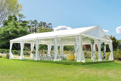 Next to the front vines, the marquee can be used in the event of bad weather or to shelter your guests from the summer heat. The walls of the marquee are transparent and can also be folded back to create an open feel, weather permitting, enabling a panoramic view of the poplars beside the stream and the Rotunda Terrace ceremony area in the distance.