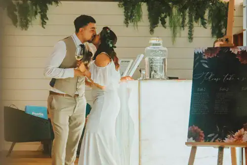 Wet weather on the day forced us inside but provided a deeply intimate, personal and beautiful ceremony. Our indoor ceremony looked beautiful.