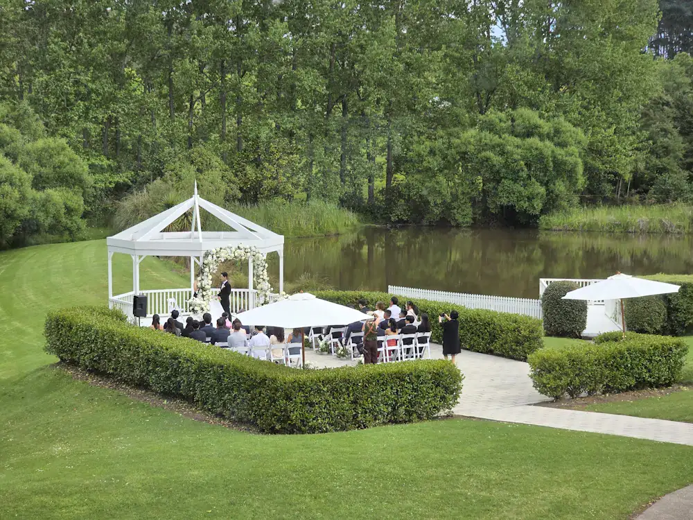 Just a few steps from the Abel Estate lake and its white jetty, the Rotunda Terrace is the much-loved ceremony area used for the vast majority of outside weddings. At the end of the bridal path, the space is bordered by a low hedge and has more than enough space for 100 guests.